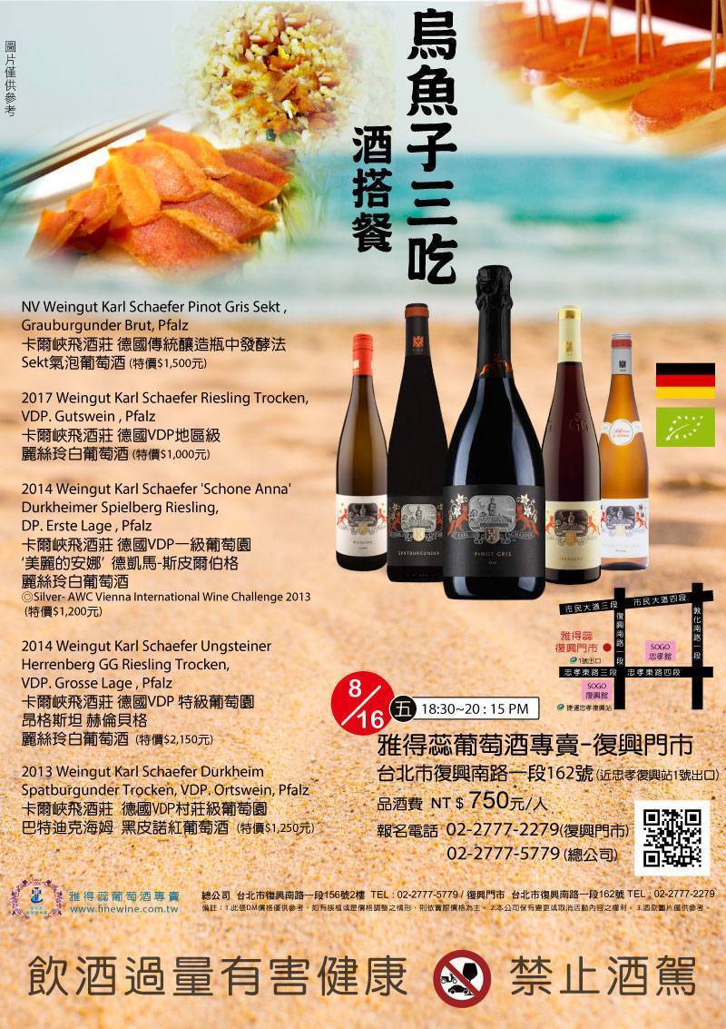 | 活動介紹: | 烏魚子俗稱「烏金」,含有豐富蛋白質及脂質。 選自品質超優的烏魚子 烏魚子一吃:烤烏魚子搭蒜,蒜有殺菌的效果並增加香味與口感! 烏魚子二吃:蘋果烏魚子,烏魚子配上鮮甜蘋果,口中留下淡淡果香。 烏魚子三吃:烏魚子炒飯來自台北老字號餐廳,烏魚子烤過去油,吃起來清香不膩,炒飯粒粒分明! 卡爾峽飛酒莊(Weingut Karl Schaefer)座落於德國法爾茨(Pfalz),榮獲30多個國家獎項,成為在Pfalz最好的莊園之一,為VDP德國頂級酒莊聯盟成員。葡萄種植著重品質量少質精,環保健康無污染的有機葡萄酒。 |