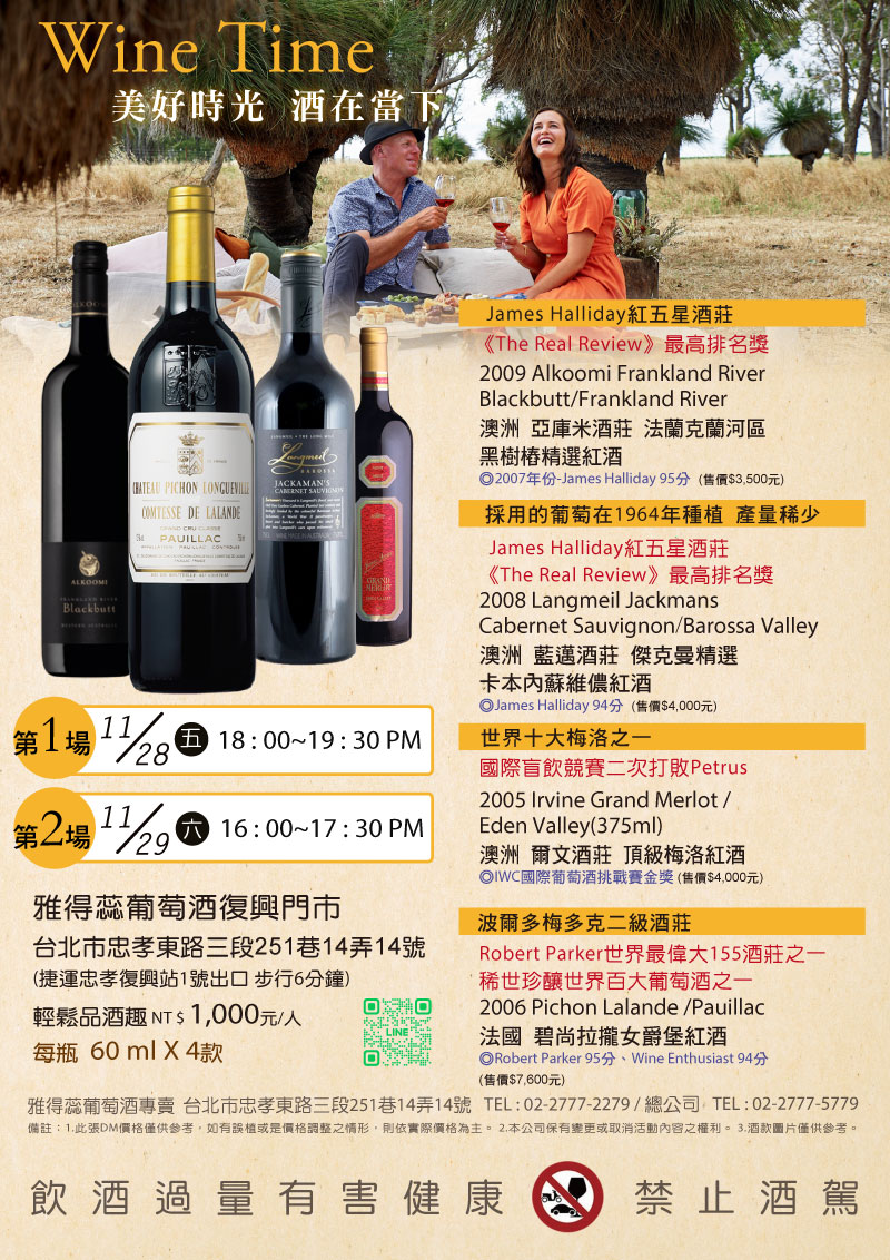 | 11/28(五)《Wine Time》美好時光 酒在當下 輕鬆品酒趣! | |||