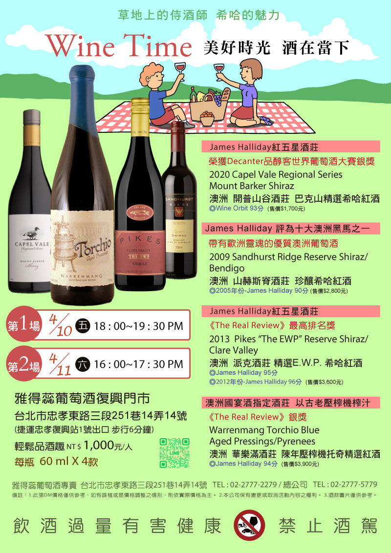 | 說明: | 《Wine Time》美好時光 酒在當下 輕鬆品酒趣! 時 間/ 2026 年4月11日(六)下午16:00~ 17:30 地 點/ 雅得蕊葡萄酒專賣 台北市忠孝東路三段251巷14弄14號(捷運忠孝復興站1號出口 步行6分鐘) TEL : (02-)2777-2279 輕鬆品酒趣 NT $1,000元/人 每瓶 60 ml X 4款 報名方式 / 02-2777-2279 (復興門市)、02-2777-5779 (總公司) . ◎報名注意事項: 1.活動當日坐下品飲,當日品飲共4款,每人每款60ml。 2.為保障顧客權益,品酒會採預先報名繳費制,需先繳費才算完成報名程序。 3.報名繳費後若要取消,恕不予退費。 4.若報名人數未達10人,本公司保有活動擇日舉行或取消之權利。 5.請勿噴灑香水與古龍水、有香氣的髮妝用品。 6.未成年請勿飲酒,報名資格需年滿18歲以上。 7.酒後禁止駕車,保護他人與自身的安全! 榮獲Decanter品醇客世界葡萄酒大賽銀獎 James Halliday紅五星酒莊 2020 Capel Vale Regional Series Mount Barker Shiraz 澳洲 開普山谷酒莊 巴克山精選希哈紅酒 ◎Wine Orbit 93分 (售價$1,700元) 帶有歐洲靈魂的優質澳洲葡萄酒 James Halliday 評為十大澳洲黑馬之一 2009 Sandhurst Ridge Reserve Shiraz/Bendigo 澳洲 山赫斯脊酒莊 珍釀希哈紅酒 ◎2005年份-James Halliday 90分 (售價$2,800元) 《The Real Review》最高排名獎 James Halliday紅五星酒莊 2013 Pikes “The EWP” Reserve Shiraz/ Clare Valley 澳洲 派克酒莊 精選E.W.P. 希哈紅酒 ◎James Halliday 95分 ◎2012年份-James Halliday 96分 (售價$3,600元) 澳洲國宴酒指定酒莊 以古老壓榨機榨汁《The Real Review》銀獎 Warrenmang Torchio Blue Aged Pressings/Pyrenees 澳洲 華樂滿酒莊 陳年壓榨機托奇精選紅酒 ◎James Halliday 94分 (售價$3,900元) 雅得蕊葡萄酒專賣 (Adelaide Finewine Cellar) 總公司 台北市忠孝東路三段251巷14弄14號 TEL : 02-2777-5779 復興門市 台北市忠孝東路三段251巷14弄14號 TEL : 02-2777-2279 禁止酒駕‧飲酒過量‧有害健康 ![]() |