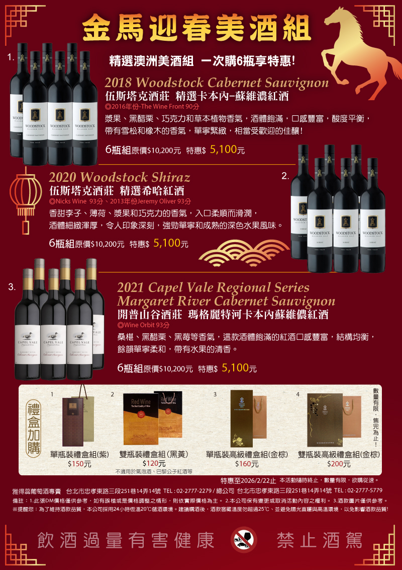 【馬到成功美酒組】精選西澳美酒組 一次購12瓶享特惠!