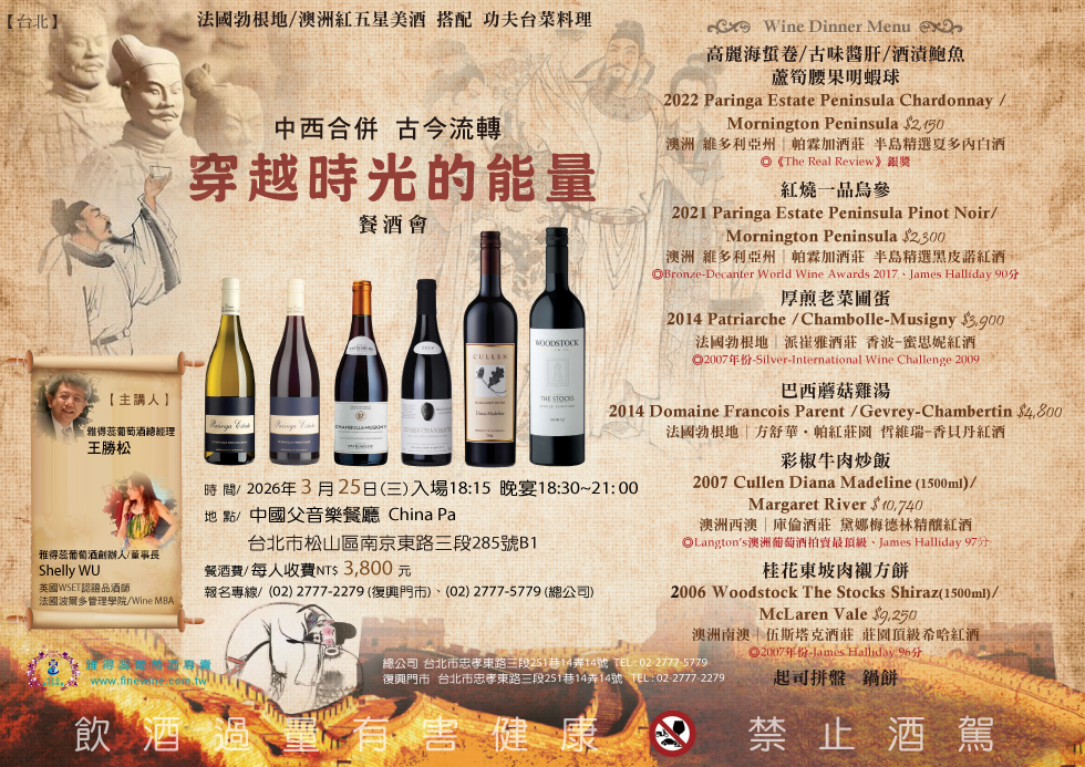3/25 (三)【中西合併 古今流轉】穿越時光的能量 餐酒會