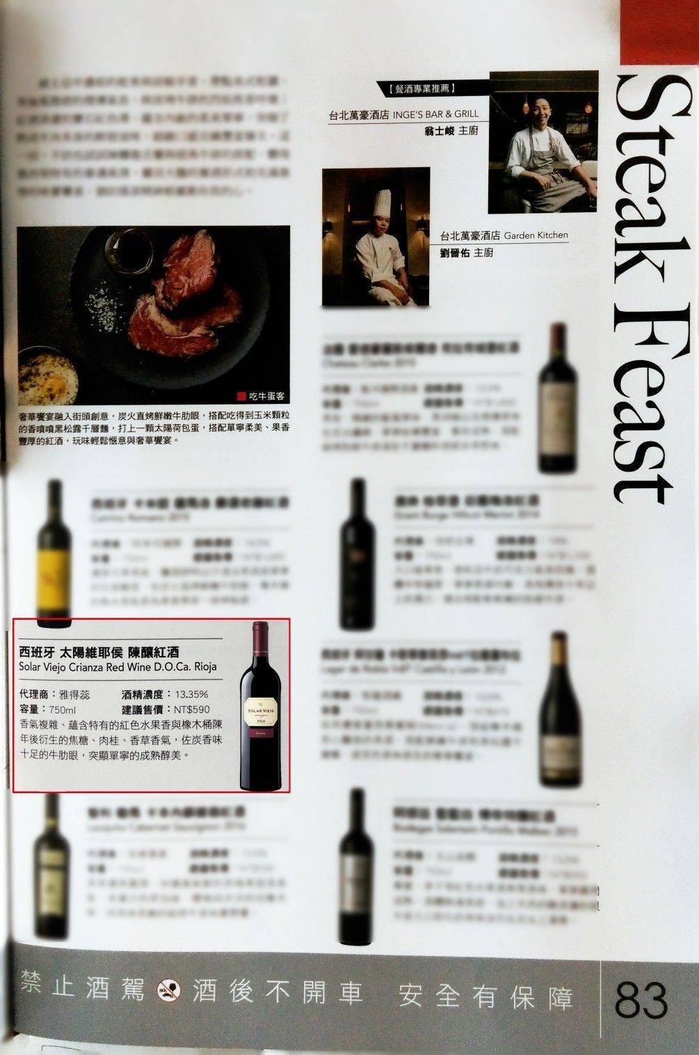 《品酩誌 2017秋季號》牛排與醇酒搭配推薦-西班牙太陽維耶侯陳釀紅酒(Solar Viejo Crianza Red Wine, D.O.Ca. Rioja )