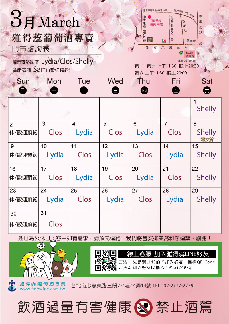 【雅得蕊葡萄酒專賣】3月門市諮詢表