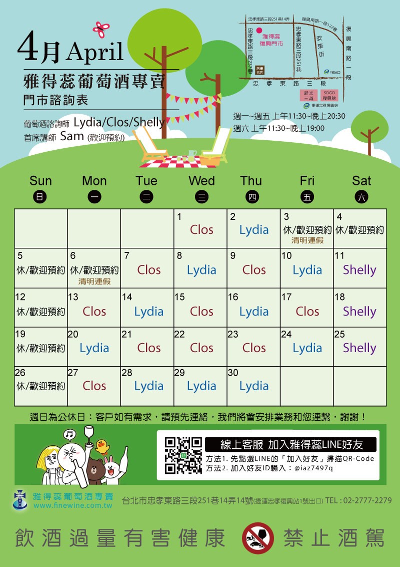 【雅得蕊葡萄酒專賣】4月門市諮詢表