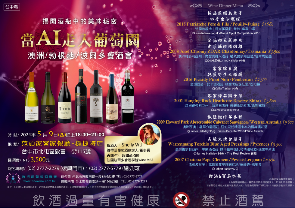 | 5/9(四)台中場【當AI走入葡萄園】澳洲/勃根地/波爾多 餐酒會 | |||